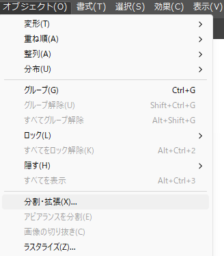 - 対象を選択し、メニュー > オブジェクト > 分割・拡張 を実行してください。これにより、特殊な機能が解除され、通常のパス(図形)に変換されます。