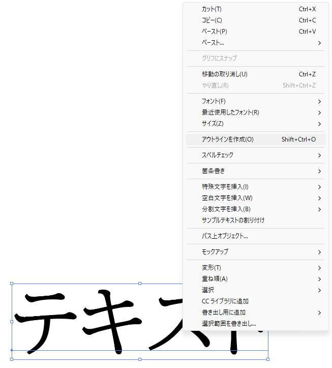 選択した文字の上で右クリック >「アウトラインを作成」を選択します。