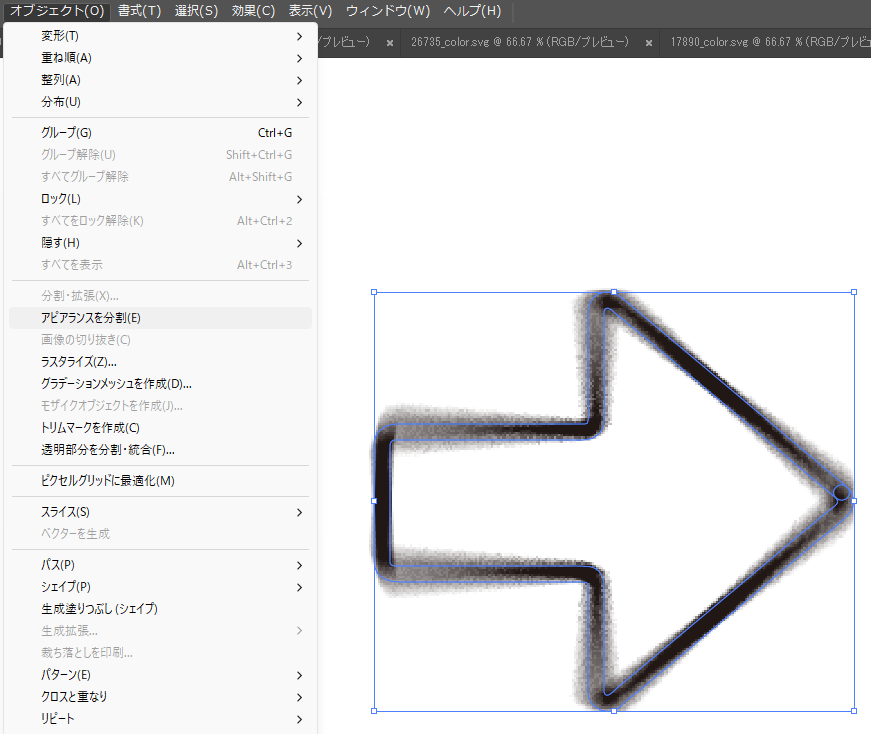 - メニュー > オブジェクト > アピアランスを分割 を選択。
